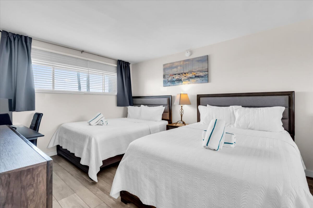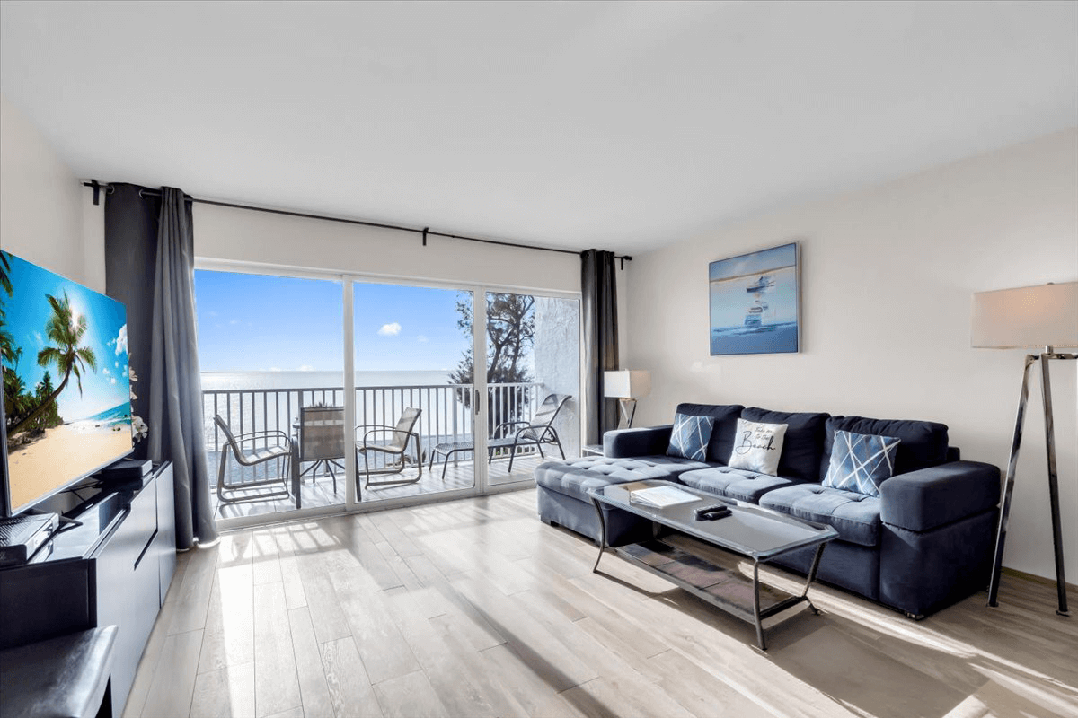 Spacious one-bedroom layout with 2 Queen beds and a large living room opens to the covered balcony and includes a comfortable sleeper sofa.